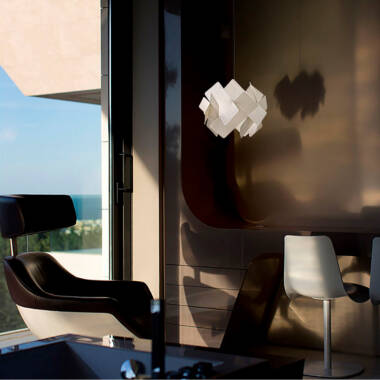 Escape es una lámpara vanguardista con una elegante estructura en forma de dominó. Sus paneles autoportantes dan la impresión de caer en un anillo de luz, su forma desafía la gravedad.