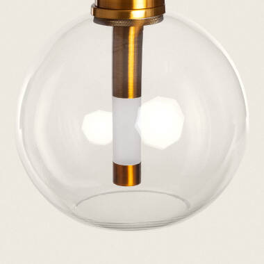 El diseño combina una pantalla esférica de cristal con un cilindro metálico interior que actúa como guía lumínica. La transparencia del cristal maximiza la difusión de la luz, mientras que el metal aporta estructura y un gesto decorativo sutil. Esta interacción de materiales y proporciones genera una presencia moderna que convive con mármol, madera natural, revestimientos neutros y ambientes contract contemporáneos. La Ludvika transmite ligereza y una estética pulida.
