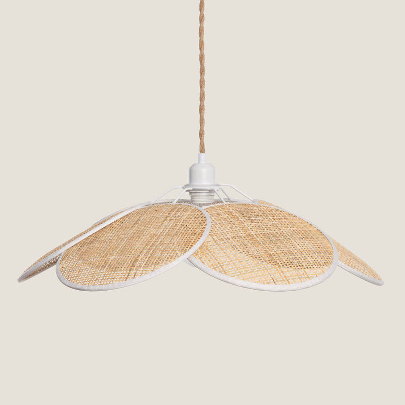 Esta lámpara colgante cuenta con una pantalla formada por seis láminas de ratán circulares que recuerdan el diseño de los pétalos de una margarita, quedando la bombilla al descubierto en el lugar del pistilo.
