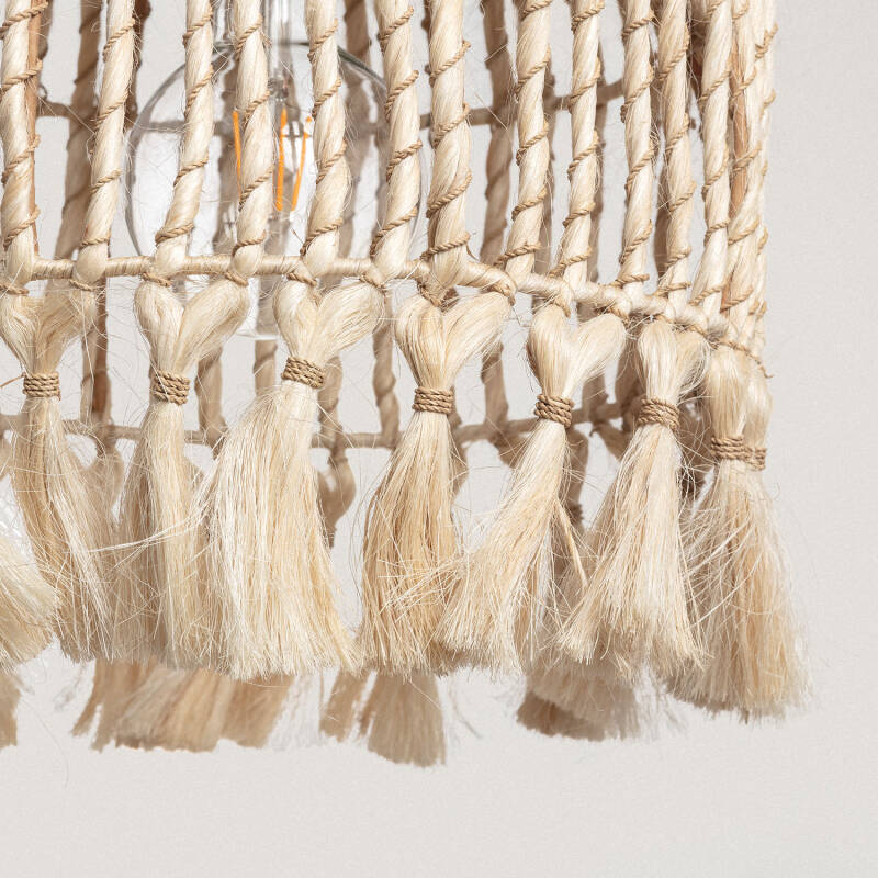 Este abajur é fabricado com dois materiais diferentes, o rattan e o rami. Na parte superior encontra-se a estrutura de rattan onde será instalado o cabo. O restante do candeeiro é confeccionado com rami em diferentes formas. O Candeeiro Suspenso Rattan e Rami Kempo Buki ILUZZIA é perfeita para quarto, sala de jantar, sala de estar, até mesmo em restaurantes ou espaços comerciais.